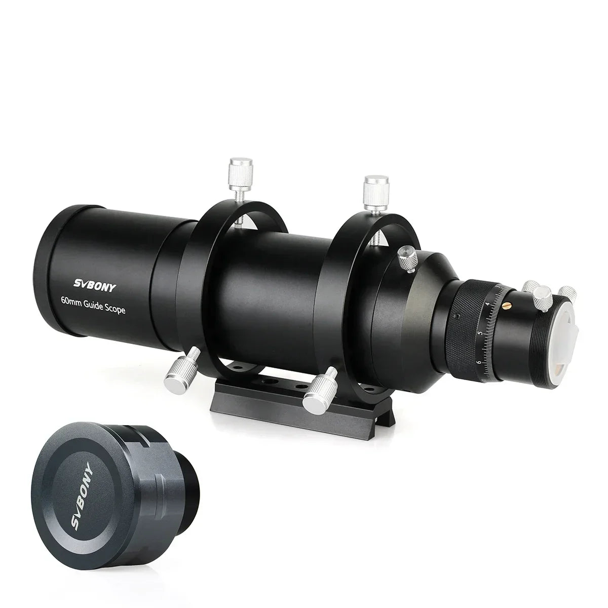 A compression ring fitting keeps any inserted autoguider cameras or astronomy accessories free of pesky scratches. CNC machined aluminum alloy body with laser engraving letters has a long performance life.