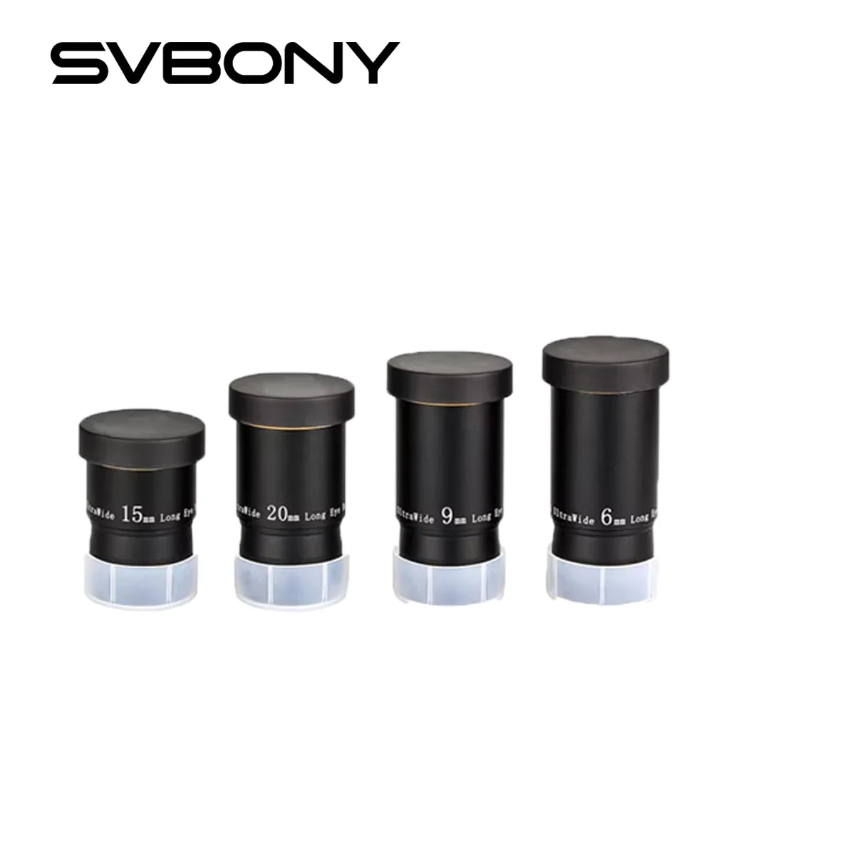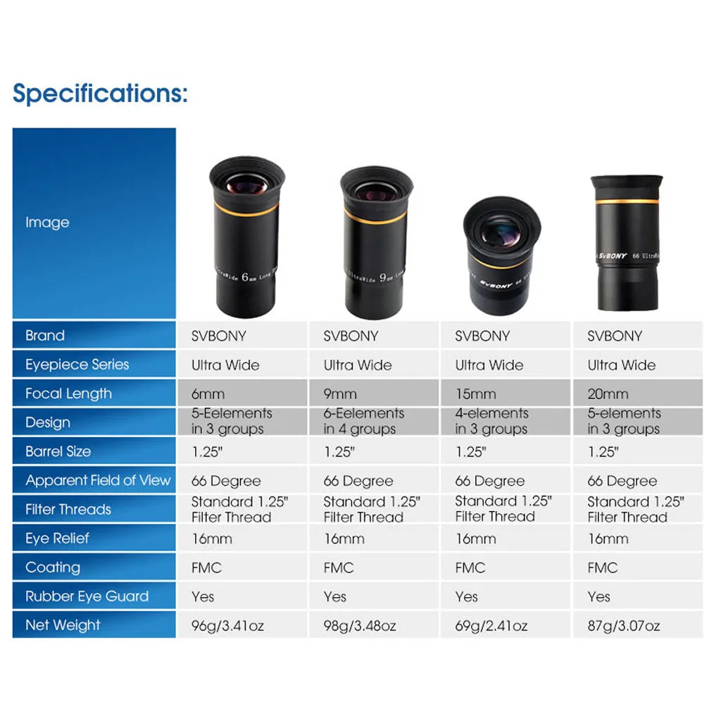 The SVBONY 1.25-inch 66 degrees Ultra Wide6mm/9mm/15mm/20mm long eye relief multi-coated telescope eyepiece set offers a wide field of view and superior optical performance. Wide 66 degrees apparent field of view lets you see more of the sky. Delivers sharp images with good color correction and contrast. Aluminum 1.25-inch eyepiece barrel is internally blackened to eliminate light scattering, and is threaded to accept 1.25" Nebula Filters.