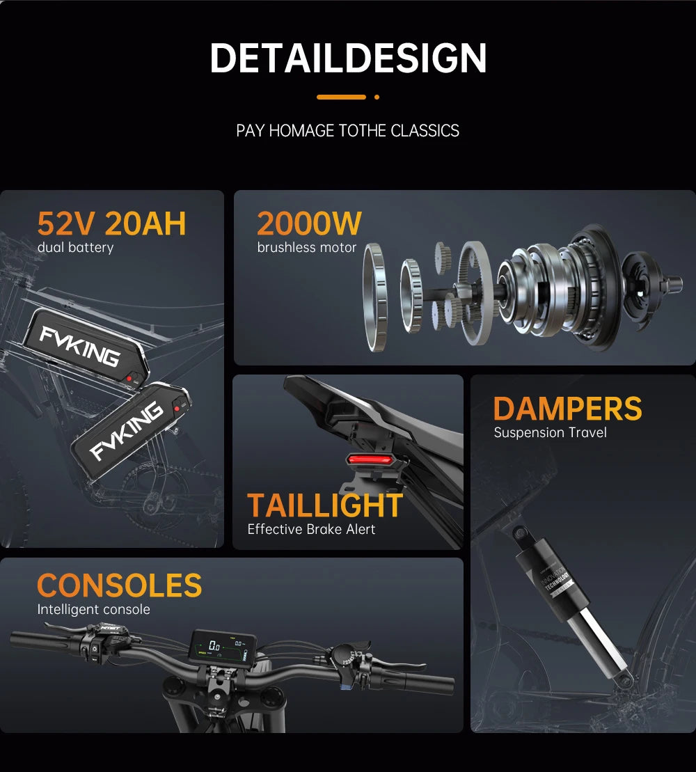 FVKING E6 Electric Bike Adults 2000W Peak Gear Hub Motors Electric Motorcycle 52V40AH Battery Speed 60Kmh Mountain E-bikes GT73