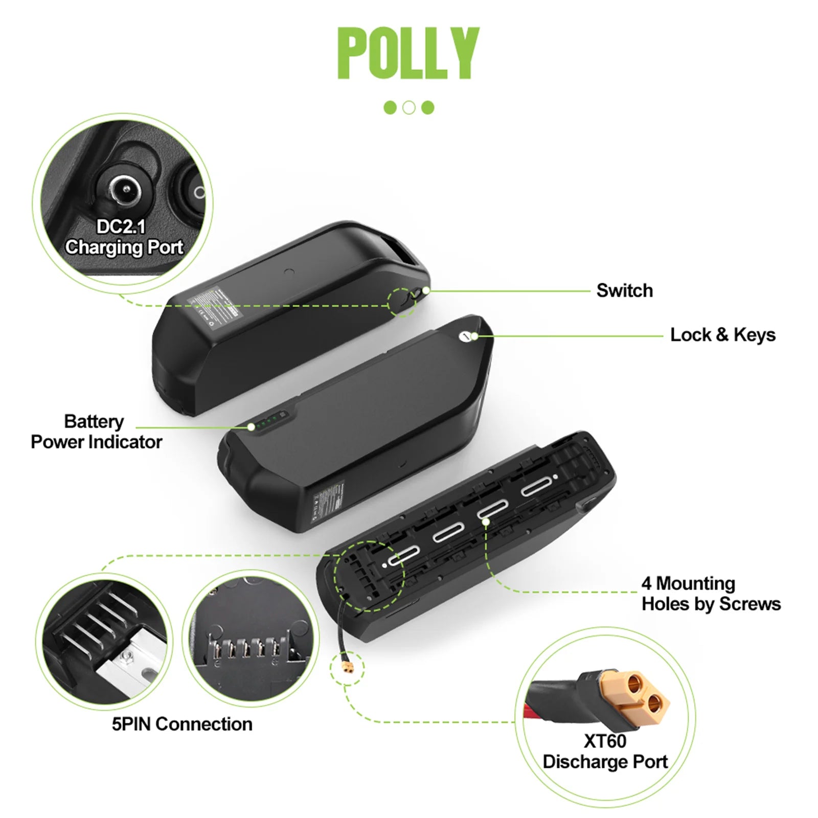 DESIGN FEATURE : Featured with a mounting bracket / battery base , you can install the Hailong Shark battery on most bikes' down tube with water bottle screw holes . It is easy to mount and remove so that you can charge the battery anywhere and anytime. With a battery lock , you don't need to worry about battery being stolen . A USB port helps you charge your phone outdoors easily . On / Off switch button and indicator light make battery using safer and save more power .
