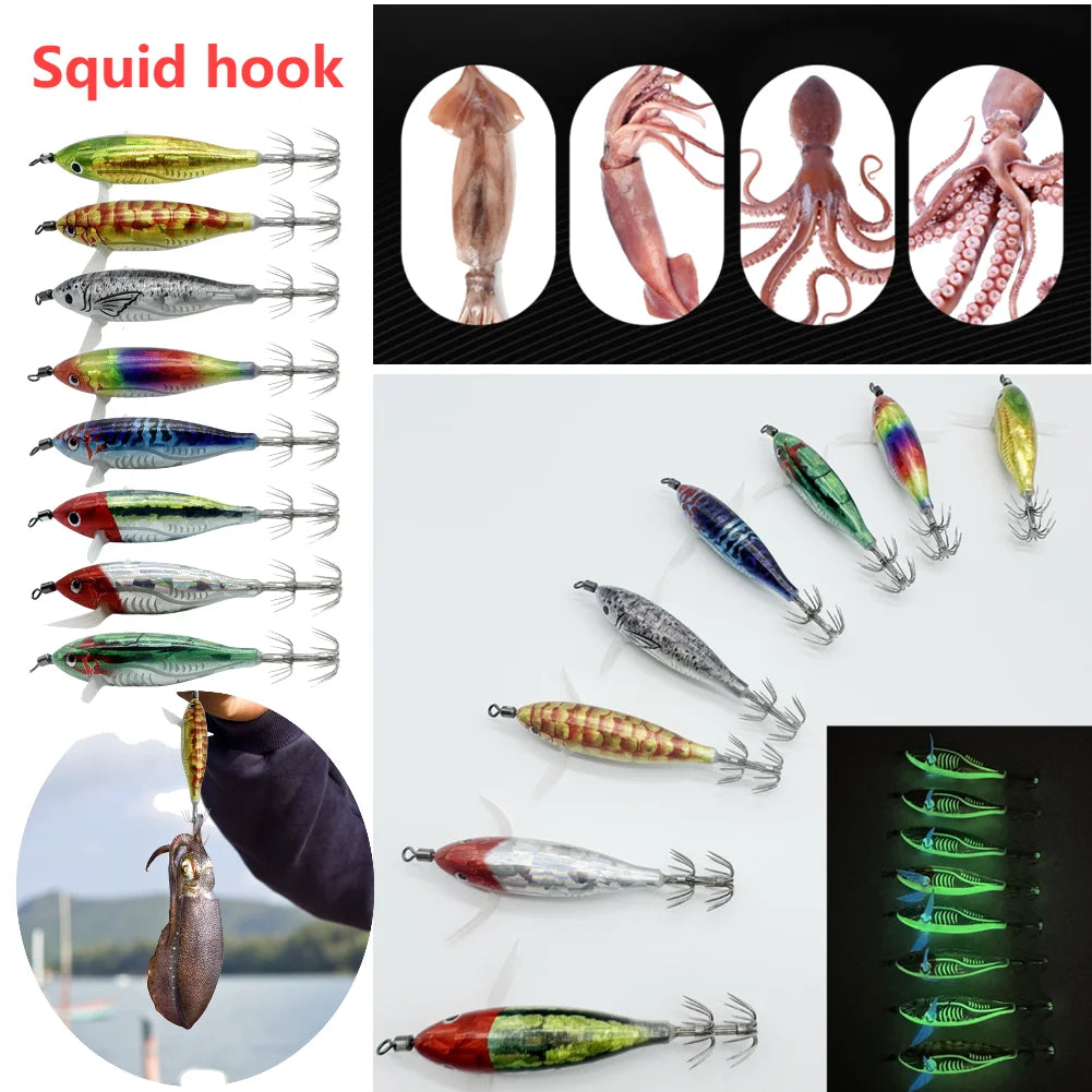 Luminous Squid Hook is an innovative product designed for fishing enthusiasts. It is made of a special material with a strong glow-in-the-dark effect, enabling it to emit a bright and attractive light in the dark night.