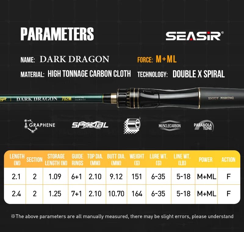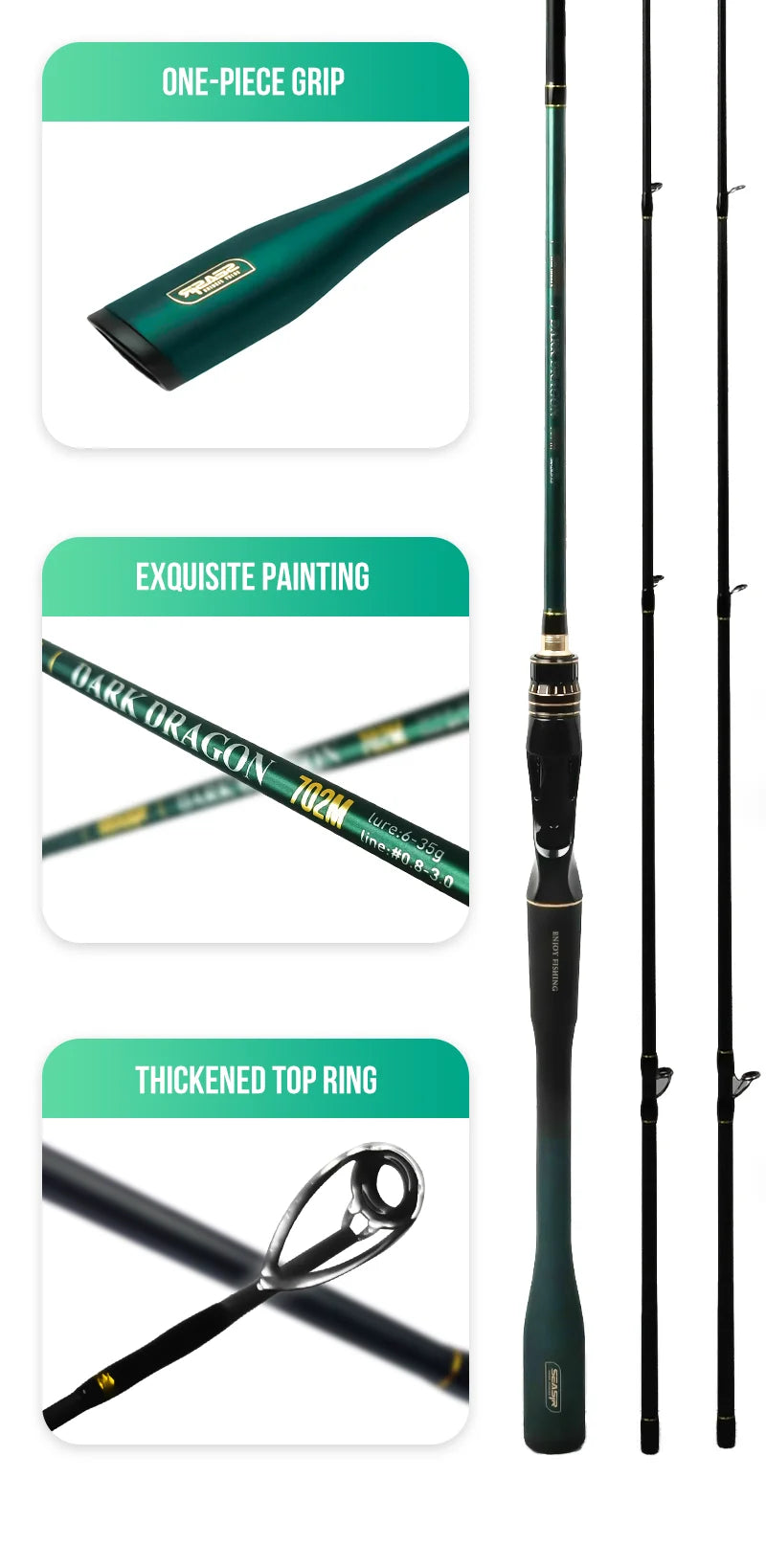 SEASIR Dark Dragon M/ML Two Rod Tips Spinning Baitcasting Fishing Rod Lure Carbon Fiber One-Piece Grip (6-35g/2.1M/2.4M)