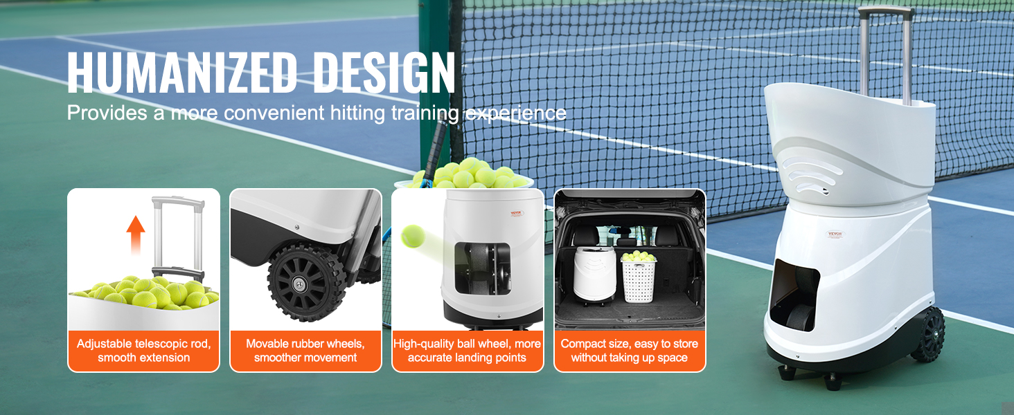 User-Friendly Design: Weighing 48 lbs (21.8 kg), this automatic portable tennis ball launcher is compact and lightweight, easily fitting into the trunk of a car for convenient transportation. It features a retractable handle and wheels for easy portability and mobility.