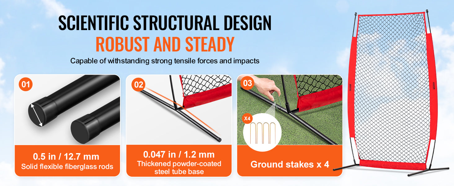 Excellent Structure: The pitching screen is made up of solid flexible fiberglass rods, thickened powder-coated steel tube bases, and secure ground stakes, making the net more stable and ensuring it stands firmly on all types of ground.