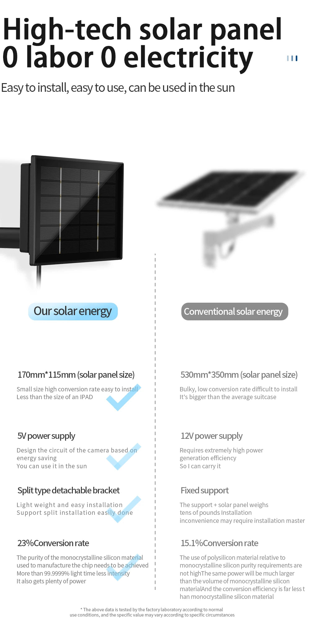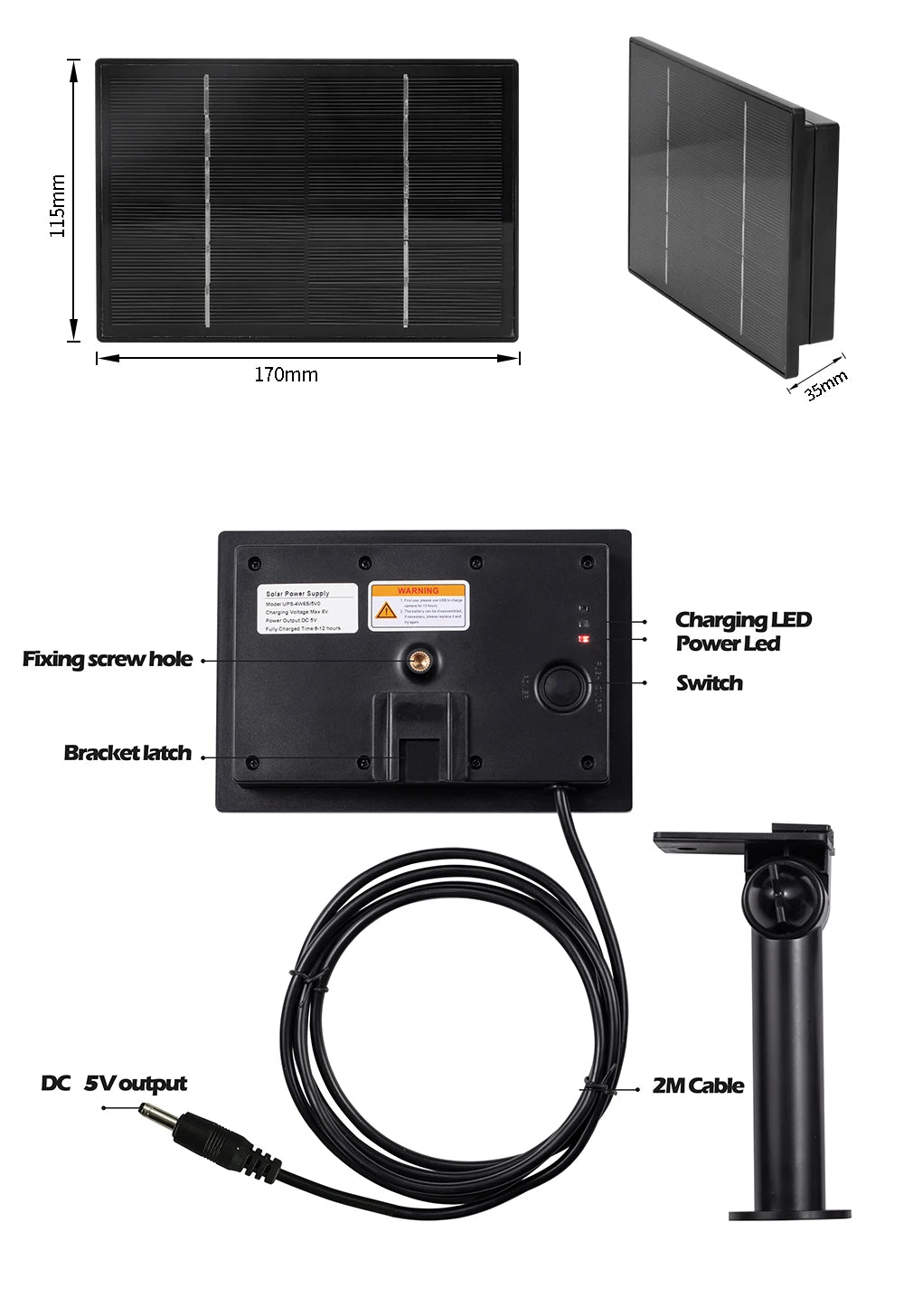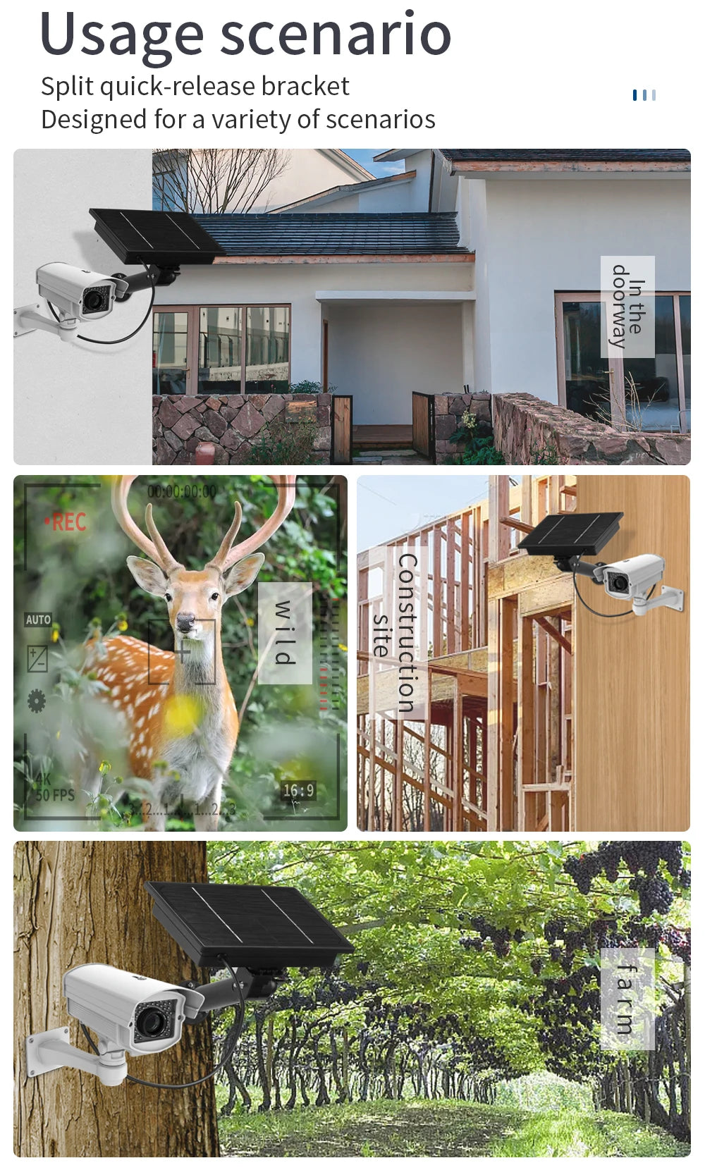 The maximum output voltage is 5V, 2.4A. Are ideal for outdoor wireless cameras to get uninterrupted and stable power from the sun. No need to waste time charging your security camera frequently, more convenient.